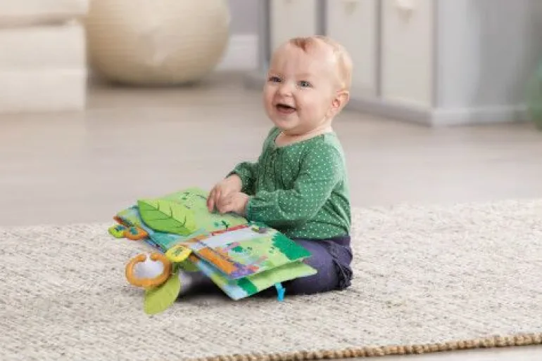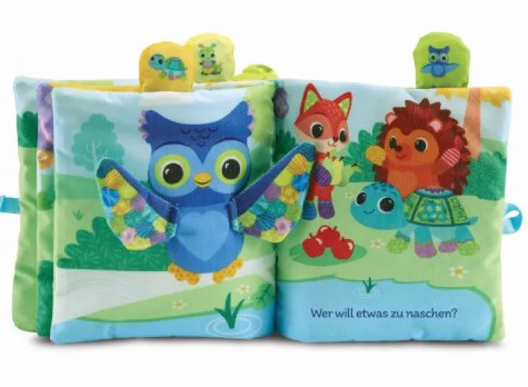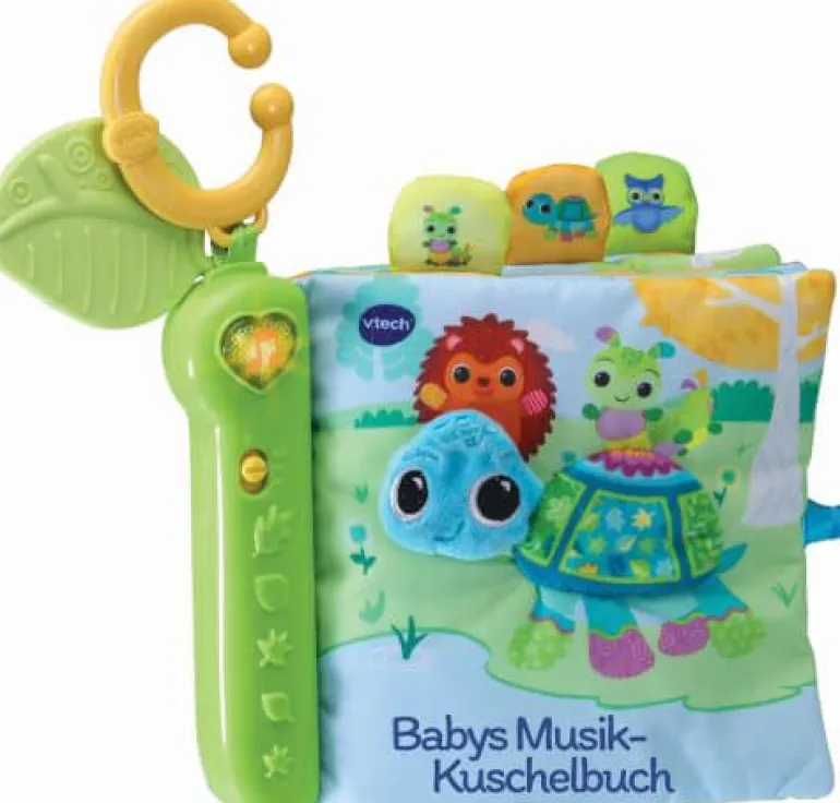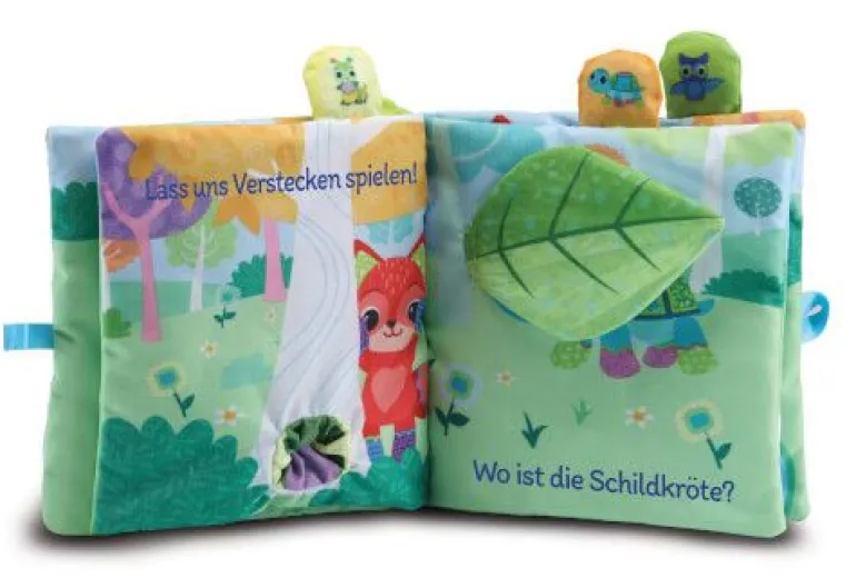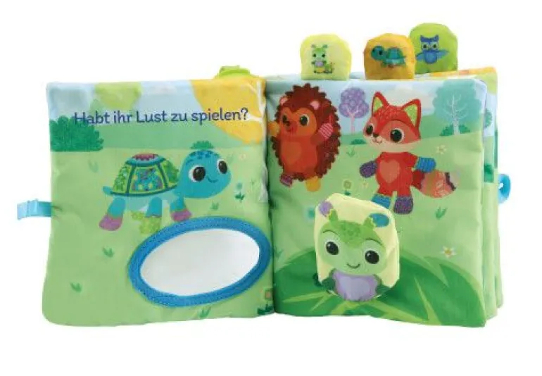 Die Schildkröte führt durch das kuschelige Buch und lädt zum Entdecken ein. Weiches Kuschelbuch mit 8 Seiten und vielen lustigen Spielelementen. Praktische C-Halterung zum Transport oder zur Befestigung am Bett oder Kinderwagen. Auf jeder Seite gibt es Elemente, die die Sinne des Babys ansprechen: Spiegel, verschiedene Stoffe, Knisterpapier, Fingerpuppen, Beißelemente, bewegliches Stoffblatt etc. Durch Drücken der Tiertasten auf jeder Seite werden entsprechende Tiergeräusche abgespielt. Das Drücken der leuchtenden Musiktaste spielt 4 tolle gesungene Lieder und 20 Melodien ab, sowie Sätze und Geräusche. Die Beißhilfe auf der Titelseite unterstützt beim Zahnen. Lautstärkeregler, kindersicheres Batteriefach und Abschaltautomatik. Demobatterien sind enthalten. Ab 6 Monaten.