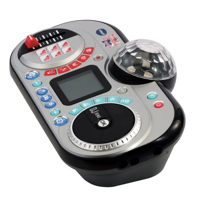 Mit dem 10-in-1 Kidi Super Star DJ Studio zum Superstar werden! Stimmreduktionfunktion: Gesang kann von allen vorinstallierten und den meisten externen Liedern reduziert oder entfernt werden. DJ-Funktion: Zum DJ werden und selbst Musik mischen. Geräuscheffekte oder Gesang hinzufügen, 8 vorinstallierte Lieder mit coolen Animationen. Diskolicht, das passend zur Musik leuchtet. Coole Stimmverzerreffekte, Aufnahmefunktion, so kann die Performance immer wieder angehört werden, Spiele und Aktivitäten. Coole Publikum-Effekte hinzufügen. Externen Musikplayer anschließen und zu den eigenen Lieblingsliedern singen. Eingebauter Lautsprecher, abnehmbares DJ Mischpult, das überall mit hingenommen werden kann. Inklusive Klinkenkabel, Lautstärkeregler, kindersicheres Batteriefach und Abschaltautomatik. Demobatterien enthalten. Alter: 6-12 Jahre.