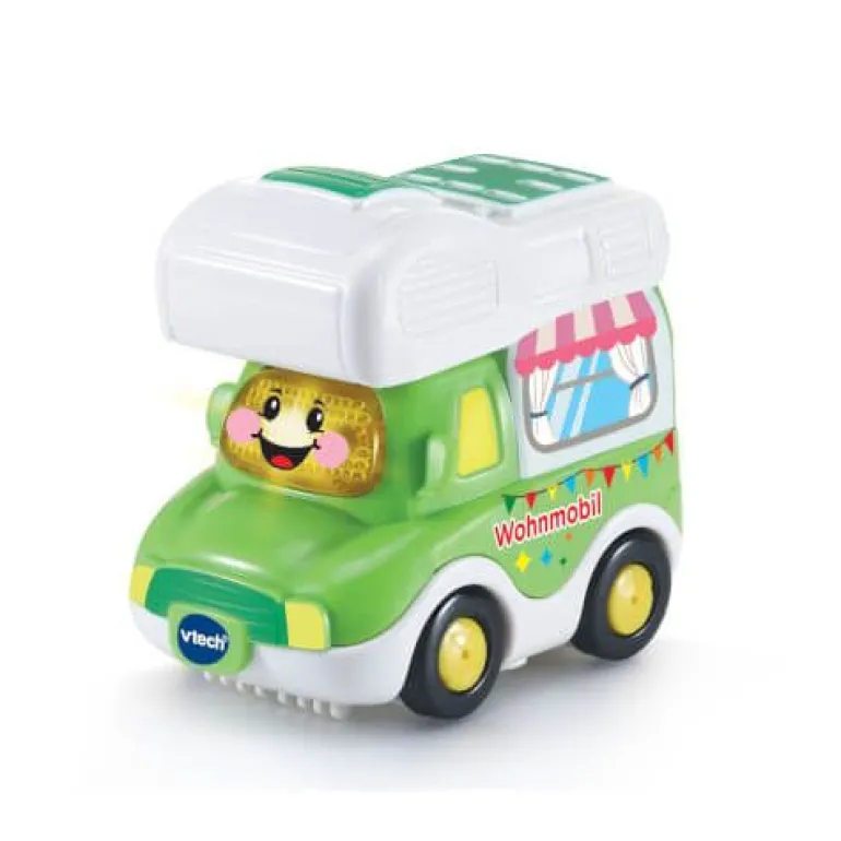 Hallo! Ich bin ein weltoffenes Wohnmobil! Spricht fröhliche Sätze, spielt kindgerechte Melodien und Lieder und macht lustige Geräusche. Eine leuchtende Taste zum Drücken. Zusätzliche Taste öffnet Türen hinten am Fahrzeug und löst passende Geräuscheffekte aus. Reagiert auf Bewegung der Räder. Reagiert auf die magischen Sensoren der Tut Tut Baby Flitzer Spielsets (separat erhältlich). 3 gesungene Lieder. 6 Kindermelodien. Kindersicheres Batteriefach und Abschaltautomatik. Demobatterien sind enthalten. Ab 12 Monaten.