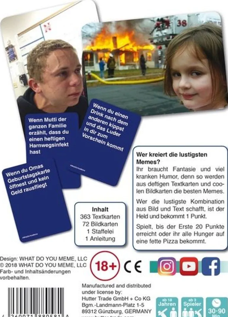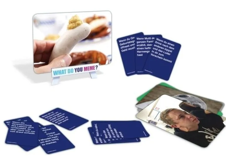 In WHAT DO YOU MEME suchst du eins der zahlreichen Memes aus und zeigt es deinen Mitspielern. Diese wählen nun eine ihrer Textkarten aus und der Punkterichter liest alle laut vor. Die Karte, die am besten, lustigsten, oder einfach am verrücktesten zum ausliegenden Meme passt, wird prämiert. Der Spieler als Belohnung die Meme-Karte, der Punkterichter wischt sich die Lachtränen aus den Augen und alle spielen glücklich weiter.