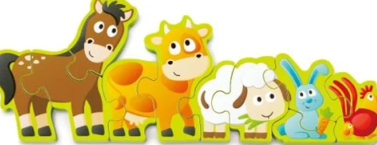10-teiliges Holzpuzzle mit Bauernhoftieren auf der einen und den Zahlen 1 bis 10 auf der anderen Seite. Das Puzzle steht aufrecht auf dem Tisch.