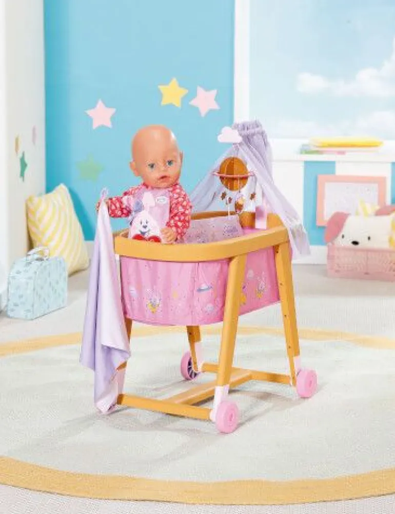 BABY borns Gute Nacht Stubenwagen in Holzoptik mit Hase Benno und Planeten Mobile. Beinhaltet passende Bettdecke und Kissen mit süßem Aufdruck.